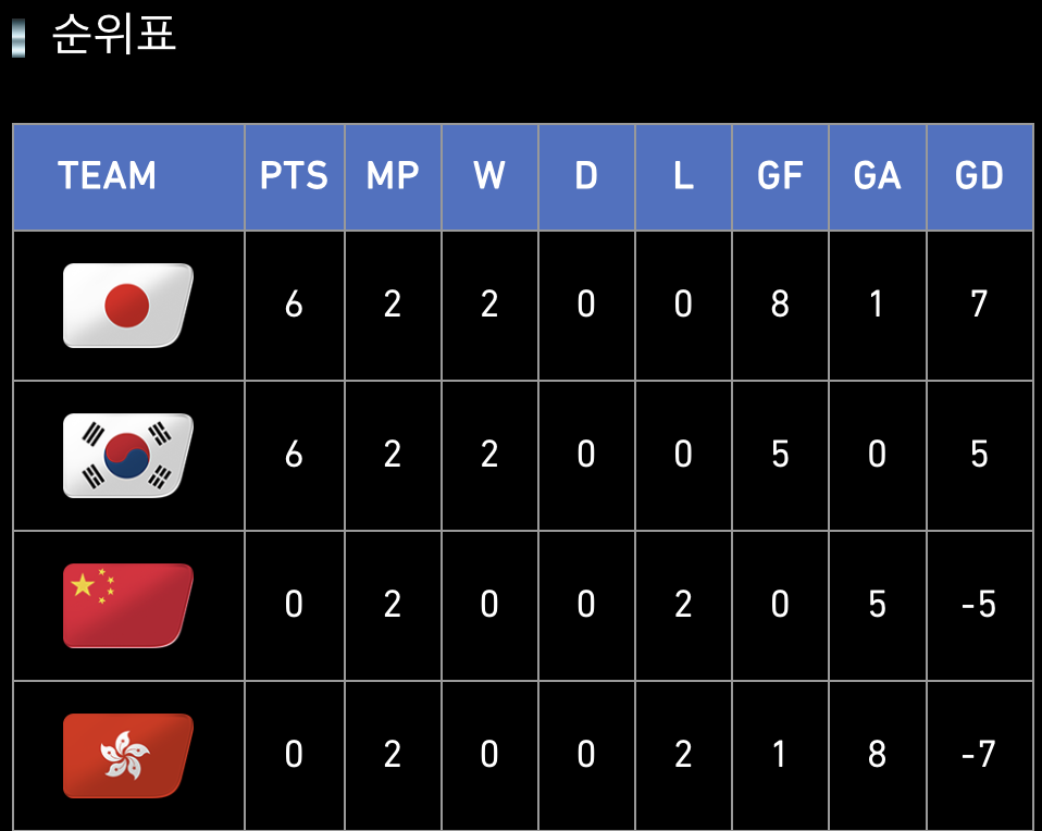 보시다시피, 대한민국과 일본은 나란히 2승으로 승점 6점을 기록하고 있지만, 골 득실에서 우리가 +2 뒤져있는 상황입니다. 이게 무슨 의미일까요? 맞습니다. 만약 이번 경기에서 비기기만 해도 우승 트로피는 일본의 차지가 됩니다. 그렇기 때문에 우리 대표팀에게는 '무조건적인 승리' 외에는 다른 선택지가 없는 셈이죠! 정말 긴장되는 상황이 아닐 수 없네요.