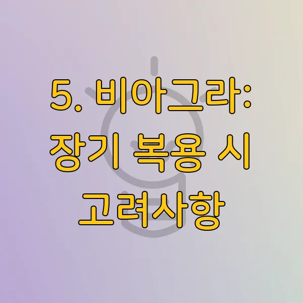 비아그라를 장기 복용할 경우 내성 발생 가능성 이 있으므로, 정기적인 의사와의 상담이 필요 합니다. 또한, 건강한 생활 습관 유지(규칙적인 운동, 균형 잡힌 식단, 금연, 절주 등)는 발기부전 예방 및 치료에 도움 이 될 수 있습니다. 약물 치료와 함께 생활 습관 개선을 병행하여 건강한 성생활을 유지하도록 노력하는 것이 좋습니다.