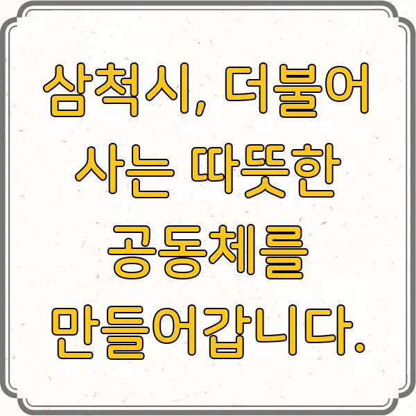 삼척시와 함께 따뜻한 공동체를 만들어가는 데 동참해 주세요! 여러분의 작은 관심과 참여가 큰 변화를 만들어낼 수 있습니다. 삼척시는 앞으로도 모두가 행복한 도시를 만들기 위해 최선을 다하겠습니다.